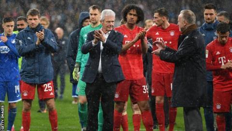ฝนกำลังตกอย่างหนักขณะที่กองกลางชาวบาเยิร์นมิวนิค Leon Goretzka และ Joshua Kimmich ทำนัดกับเซบาสเตียนรูดี้แห่งฮอฟเฟ่นไฮม์ในวงกลมกลาง